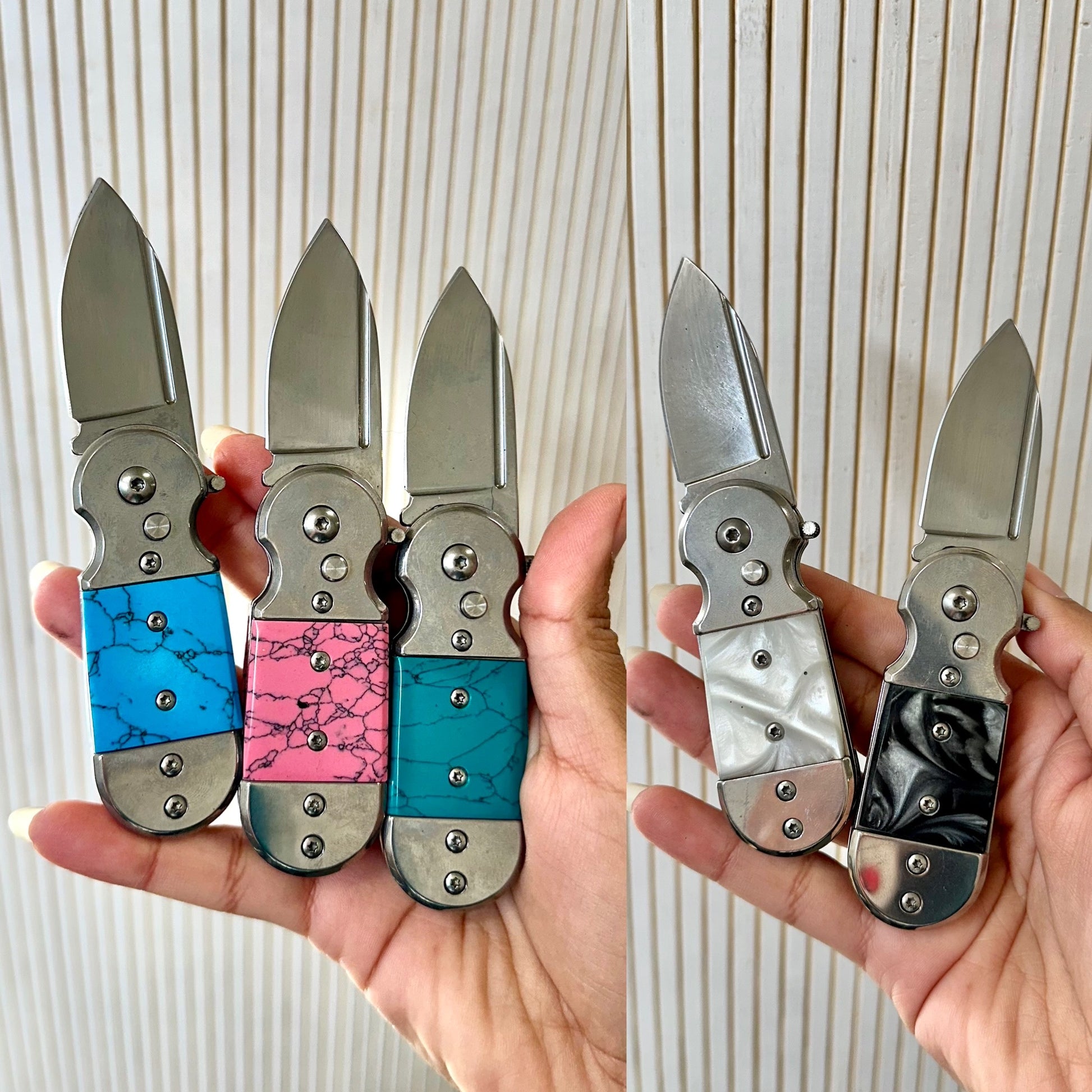 ✨ Sleek, compact, and ready to make a statement, the Mini Marbled Milano is the perfect blend of style and functionality. This automatic knife features a 3CR13 stainless steel blade with a sliding safety lock, so it’s as safe as it is sharp. Its stainless steel handle boasts a stunning green marble inlay, adding a touch of elegance to your everyday carry.