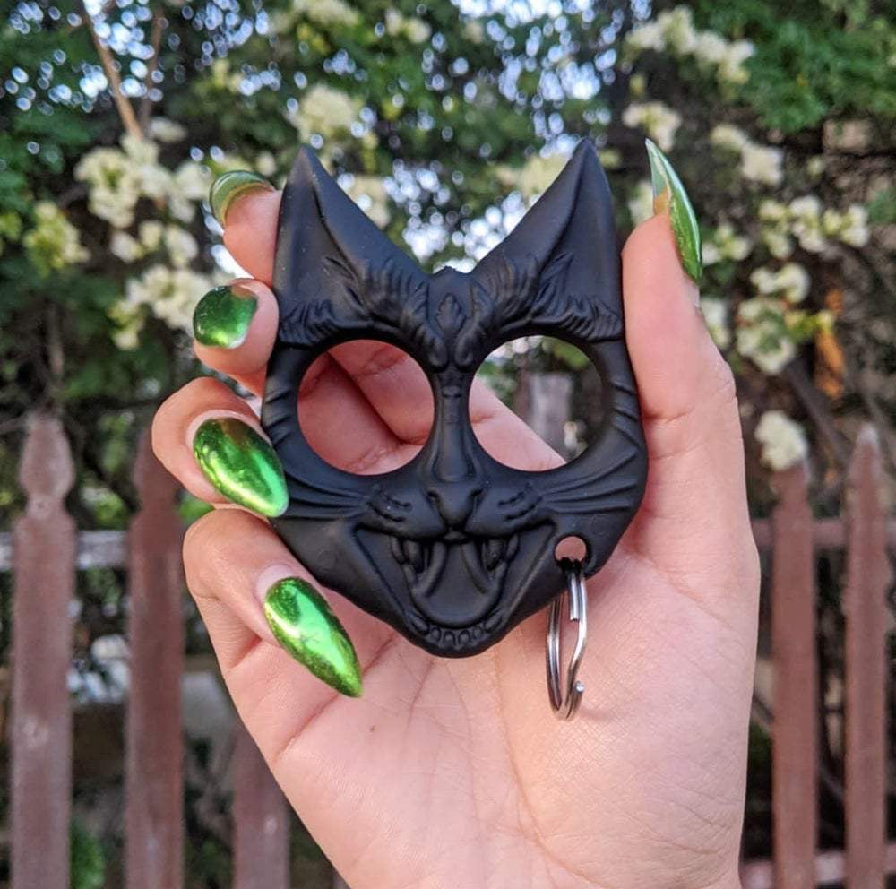 Introducing the Evil Kitty Keychain, a formidable self-defense tool crafted from ultra-tough plastic material that is exceptionally difficult to break. Designed for quick and effective use, simply strike and run to deter attackers effectively.