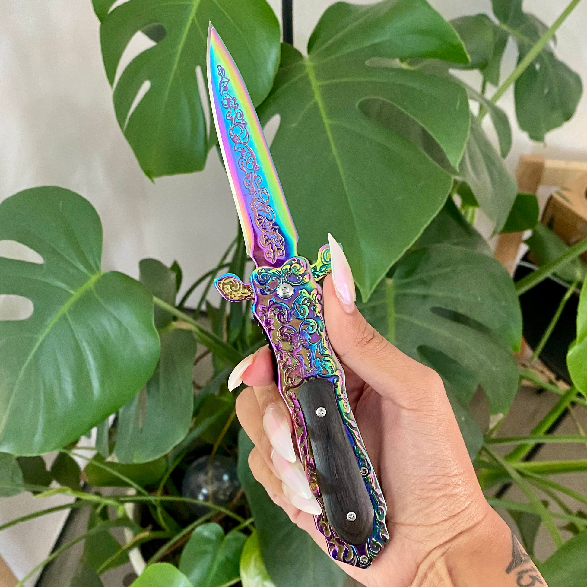 A little flashy, a little fierce.. this medieval-style rainbow knife is ready to make a statement. Spring-assisted and seriously sharp, it’s built to stand out and stay ready.