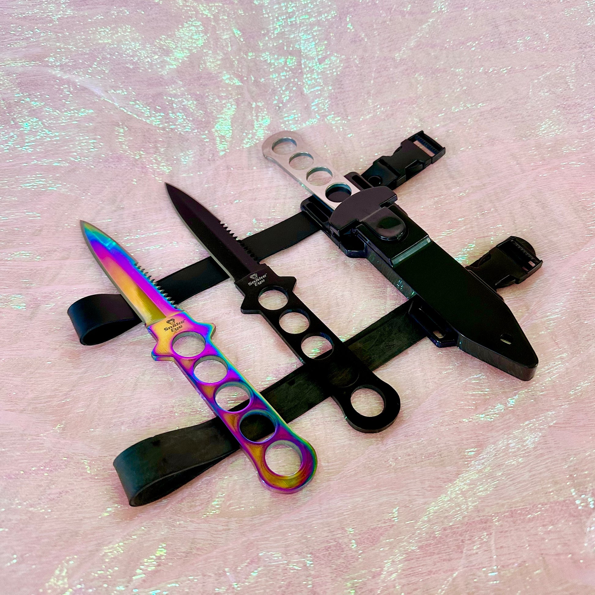 Introducing the Thigh High Garter Belt Dagger, a dangerously sexy accessory featuring a survivor fixed blade diving knife in your choice of rainbow, gold, black or silver.