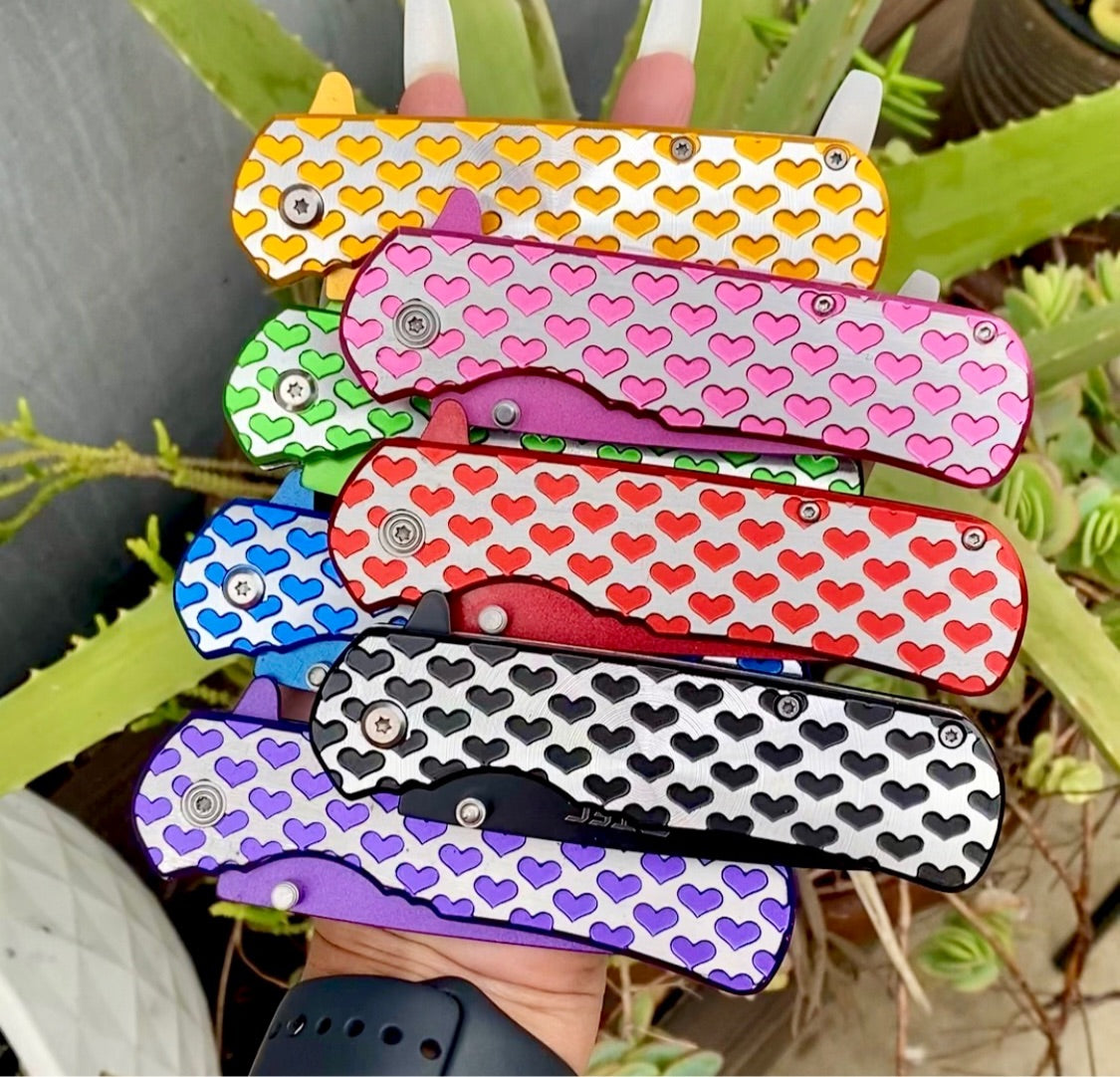 Introducing the Heart Attack Pocket Knife, a stylish and practical self-defense tool adorned with hearts all over the handle, available in various color choices with matching blades.